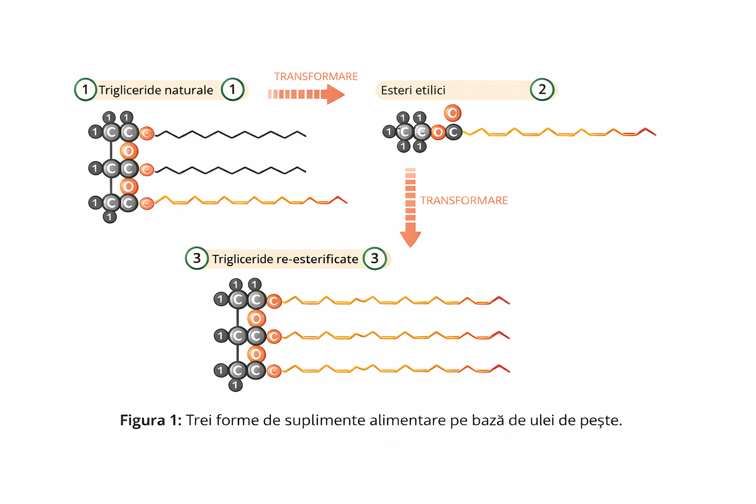 Grasimile din alimentatie, dar si din uleiul de peste, se gasesc in mod natural sub forma de trigliceride. Acestea sunt formate din trei molecule de acizi grasi legate de o molecula de glicerol (vezi Figura 1).